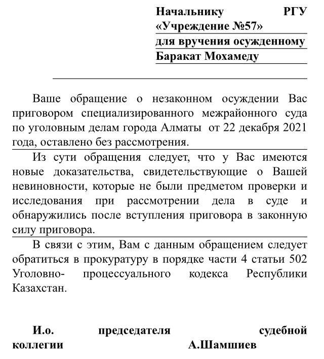 Мы писали о громком уголовном деле британского пилота Мохамеда Бараката. Он сейчас отбывает наказание в зареченской колонии общего режима за убийство своей полуторогодовалой дочери Софии в октябре 2019 года. Баракат не признаёт вину и называет себя жертвой коррупции и произвола правоохранительных органов Казахстана. По его словам, во время следствия и суда у него вымогали 215 тыс. долларов за содействие в получении мягкого наказания. Однако он не отдал деньги доброхотам, поскольку они не гарантировали ему успешный исход, да и сам характер подобной «сделки» претил его внутренним убеждениям.