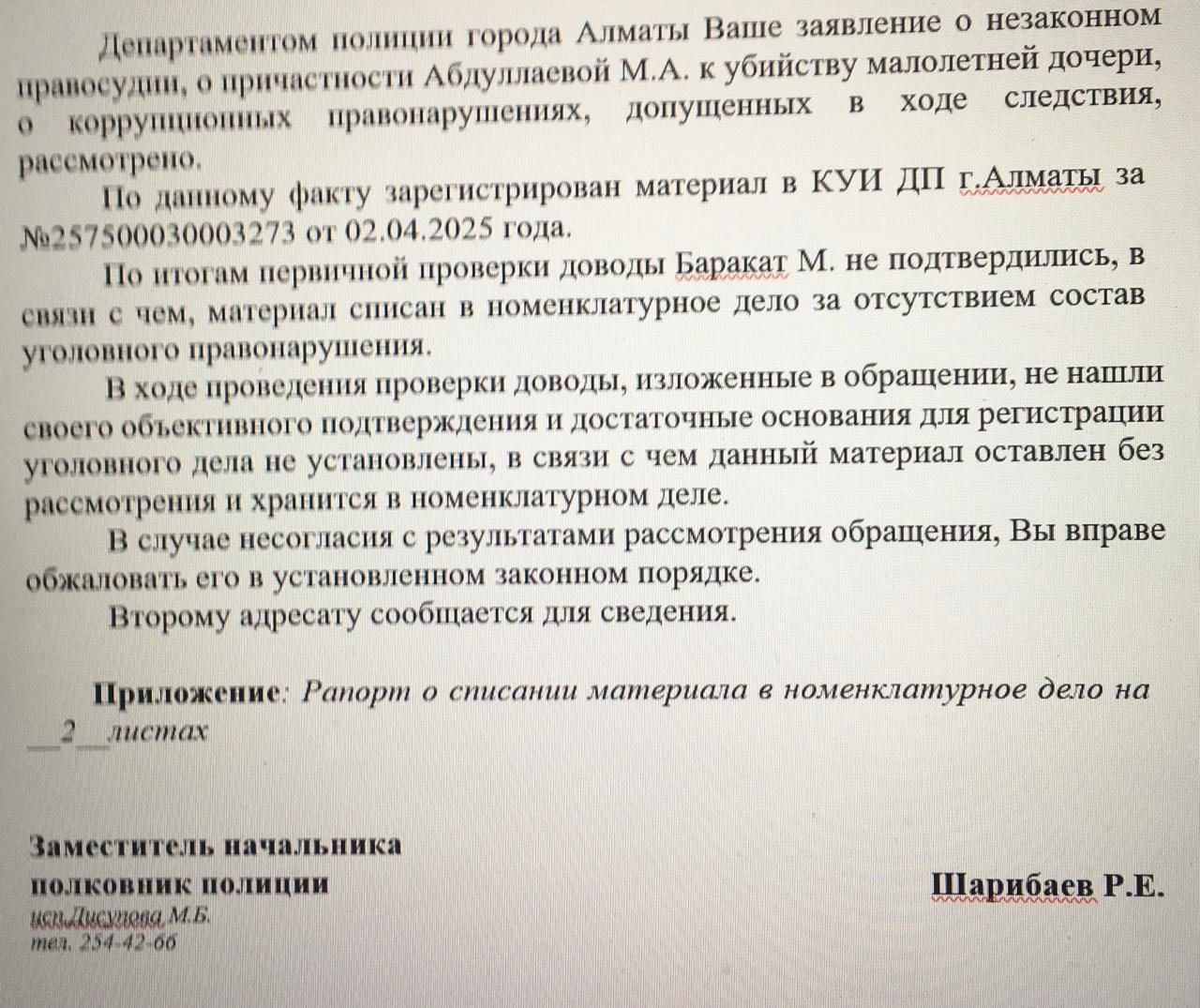 — Вот именно, что отдельные следователи департамента полиции Алматы горазды закрывать дела, лишь бы не утруждать себя исследованием доказательств. У меня есть копия рапорта следователя о том, что оснований для начала досудебного расследования по моим доводам нет. Дескать, я не предоставил ему аудиозаписи переговоров со своей женой, но это неправда. Я отправил её вместе со скриншотами переписок с Мадиной в WhatsApp в адрес департамента полиции города Алматы.