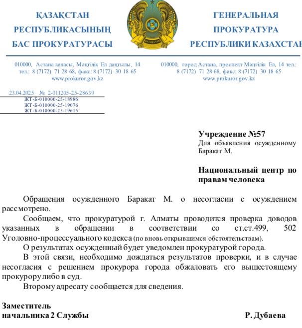 — Я обращался за помощью к омбудсмену Артуру Ластаеву. Он прислал в ответ отписку, в которой посоветовал адресовать все жалобы Генпрокуратуре. Писал я и в администрацию президента РК, но там просто перенаправили моё обращение всё в ту же Генпрокуратуру. Пришлось снова обращаться в главное надзорное ведомство. 23 апреля 2025 года мне пришёл ответ, что по моей жалобе проводится проверка, и мне надо дождаться её результатов. Также я жду ответа от начальника управления собственной безопасности департамента полиции города Алматы. Ему я жаловался на нарушение законности в работе следователей. Посмотрим, чем всё закончится.