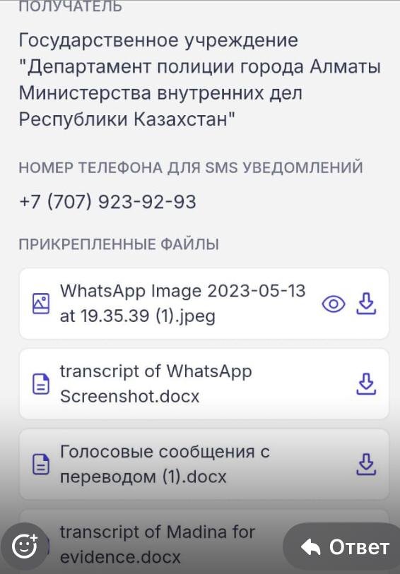 — Вот именно, что отдельные следователи департамента полиции Алматы горазды закрывать дела, лишь бы не утруждать себя исследованием доказательств. У меня есть копия рапорта следователя о том, что оснований для начала досудебного расследования по моим доводам нет. Дескать, я не предоставил ему аудиозаписи переговоров со своей женой, но это неправда. Я отправил её вместе со скриншотами переписок с Мадиной в WhatsApp в адрес департамента полиции города Алматы.