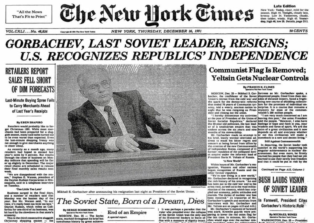 Распад Советского Союза продолжился подписанием Беловежских соглашений и Алма-Атинской декларации 8 и 21 декабря 1991 года, когда было создано Содружество Независимых Государств. Горбачёв сложил свои полномочия 25 декабря, а на следующий день СССР прекратил своё существование.