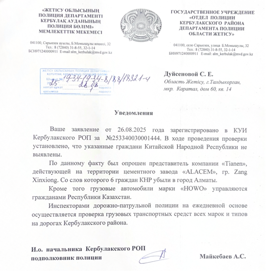 Единственный государственный орган, который ответил чётко, — управление занятости Жетысу. По их информации, ALACEM в 2025 году получил 45 разрешений для иностранцев: инженеры, техники, переводчик. Но ни одного разрешения на водителей. А значит, официально эти шесть китайцев не могли быть за рулём, но они там были.