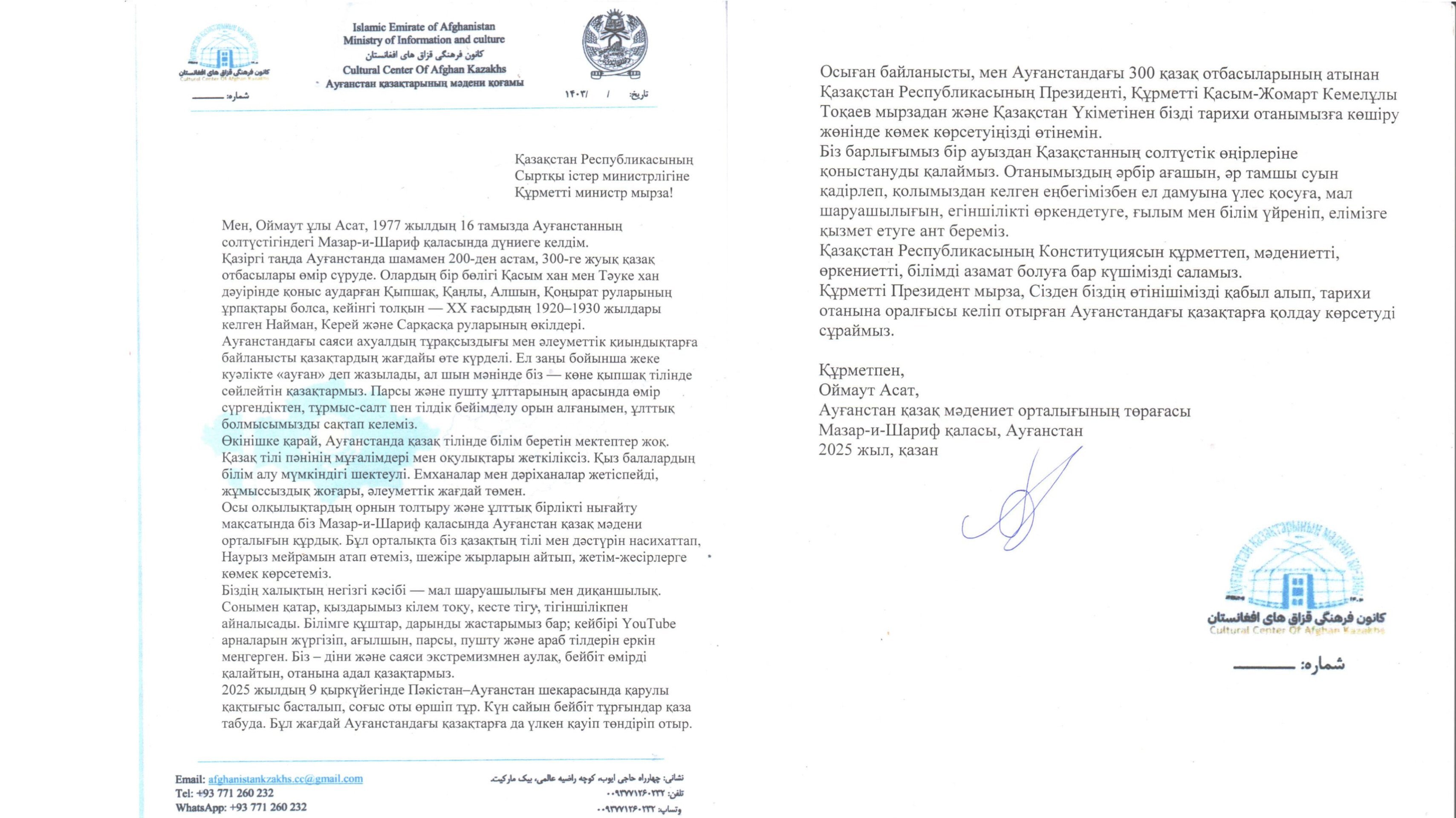 В письме председателя Афганского казахского культурного центра хаджи Асата Оймауыта говорится, что в Афганистане проживает около 200–300 казахских семей: