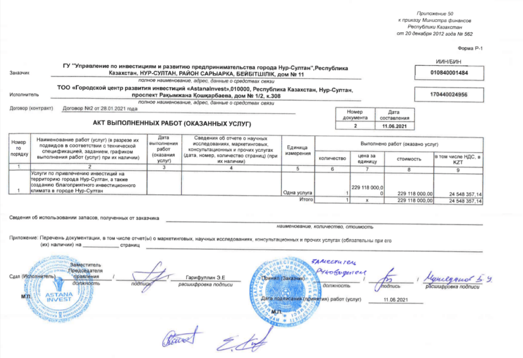 По акту выполненных работ, Городскому центру развития инвестиций «Astanainvest» акимат оплатил 229 млн тенге из 447 млн.