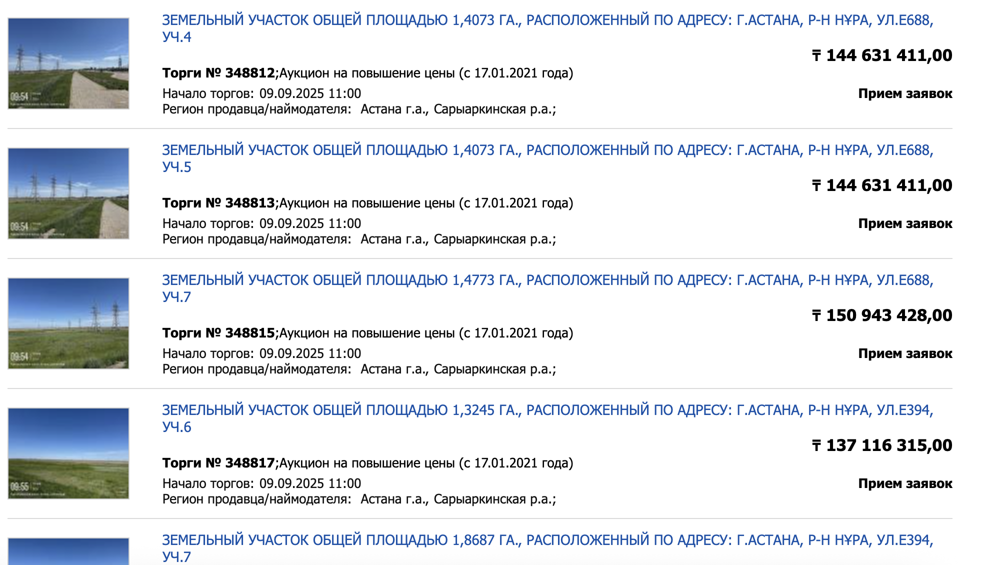 Все эти земли находятся в районе Нура, но имеют разное назначение: от личного строительства до сельскохозяйственной деятельности. Стоимость тоже приличная — от пары десятков до нескольких сотен млн тенге. Общая стоимость всех земель — 11,7 млрд тенге.
