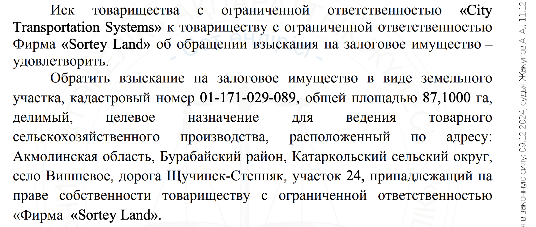 Также на продажу выставили земельный участок в Бурабае стоимостью 228 млн тенге. Его CTS отсудила у «Фирмы Sortey Land», которая, в свою очередь, также была должником «Банка Астаны».