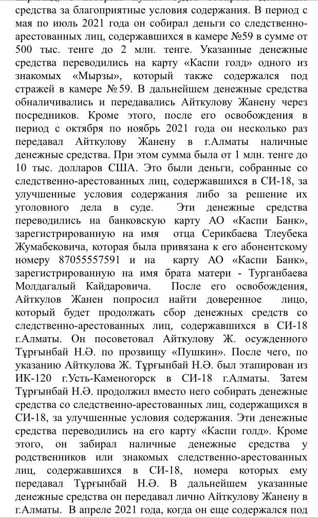«Свидетель Серикбаев заявил, что сотрудники СИ-18 избивали его и вырвали ногти на пальцах рук, чтобы получить нужные им показания. Устав от постоянных пыток, он пытался покончить жизнь самоубийством, но его спасли. Кроме того, Серикбаев заявил в суде, что в период досудебного расследования сотрудники департамента собственной безопасности КНБ вывозили его из следственного изолятора на встречу с его знакомыми, чтобы он склонил их к даче ложных показаний против Айткулова. После таких поездок сотрудники ДСБ, с его слов, давали ему спиртные напитки и наркотики, которые он беспрепятственно проносил в СИ-18. Серикбаев вместе с другим свидетелем говорил в суде, что "коммерческие камеры" в следственном изоляторе организовали сами же сотрудники пенитенциарного учреждения», — сказал Марденов.