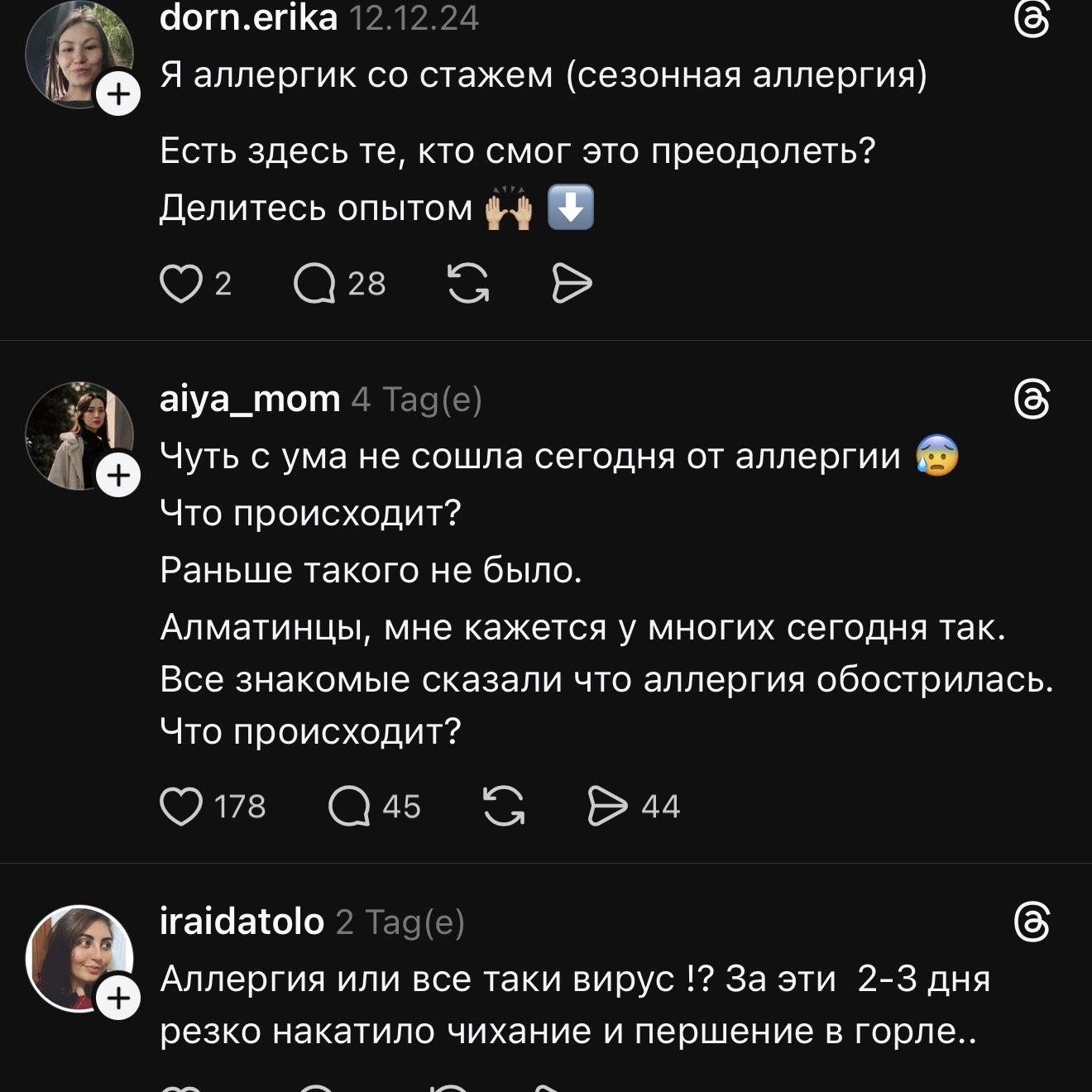 «Аллергия или всё-таки вирус!? За эти два-три дня резко накатило чихание и першение в горле»,делится переживаниями пользовательница Threads.