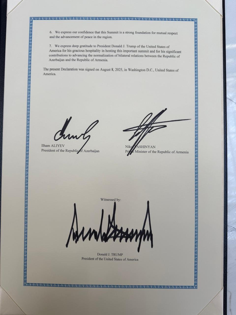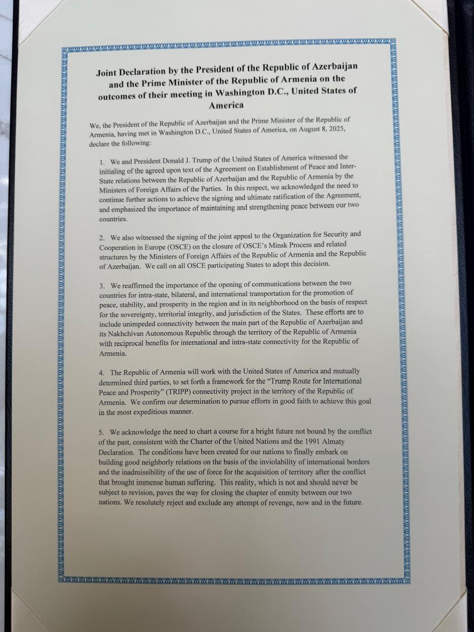 Документ закрепляет обязательство сторон двигаться к подписанию и ратификации уже согласованного мирного договора, а также подтверждает отказ от военного противостояния, уважение суверенитета и территориальной целостности друг друга.