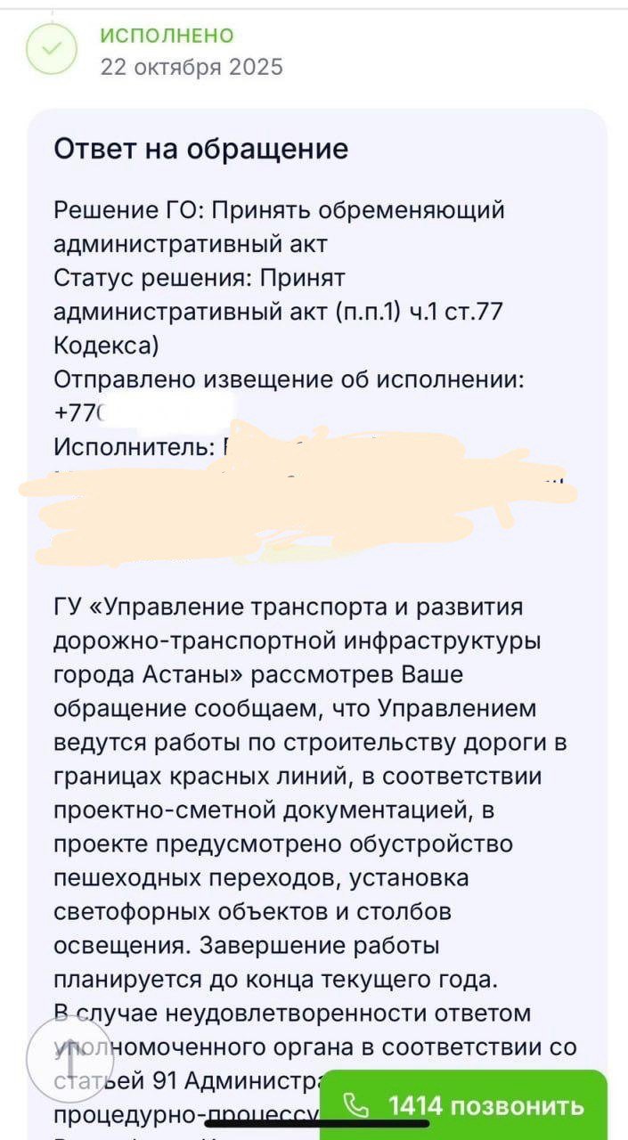«На улице Айтеке би от улицы Сыганак до улицы Мухамедханова обеспечен проезд. Работы по проекту продолжаются, установлены временные знаки. В проекте предусмотрено обустройство пешеходных переходов, установка светофорных объектов и столбов освещения. Согласно графику, выполнение строительно-монтажных работ осуществляется поэтапно в соответствии с утверждённым планом с учётом установленных сроков и объёмов. Все действия подлежат контролю и фиксируются в еженедельных отчётах. Завершение работы планируется до конца текущего года»,ответили в управлении транспорта и развития дорожно-транспортной инфраструктуры Астаны.