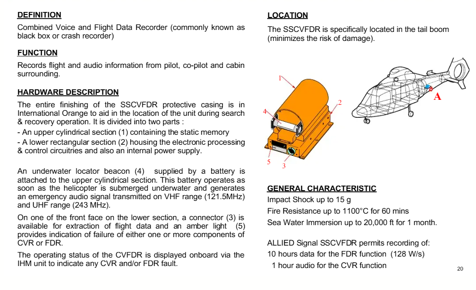 CVFDR фиксирует переговоры экипажа и десятки параметров полёта, что позволяет воссоздать каждую секунду происшествия, а системы HUMS и UMS помогают выявлять неисправности до их критической стадии. Данные сохраняются в твердотельной памяти и передаются на землю через PCMCIA-носитель, а затем анализируются на наземной станции.