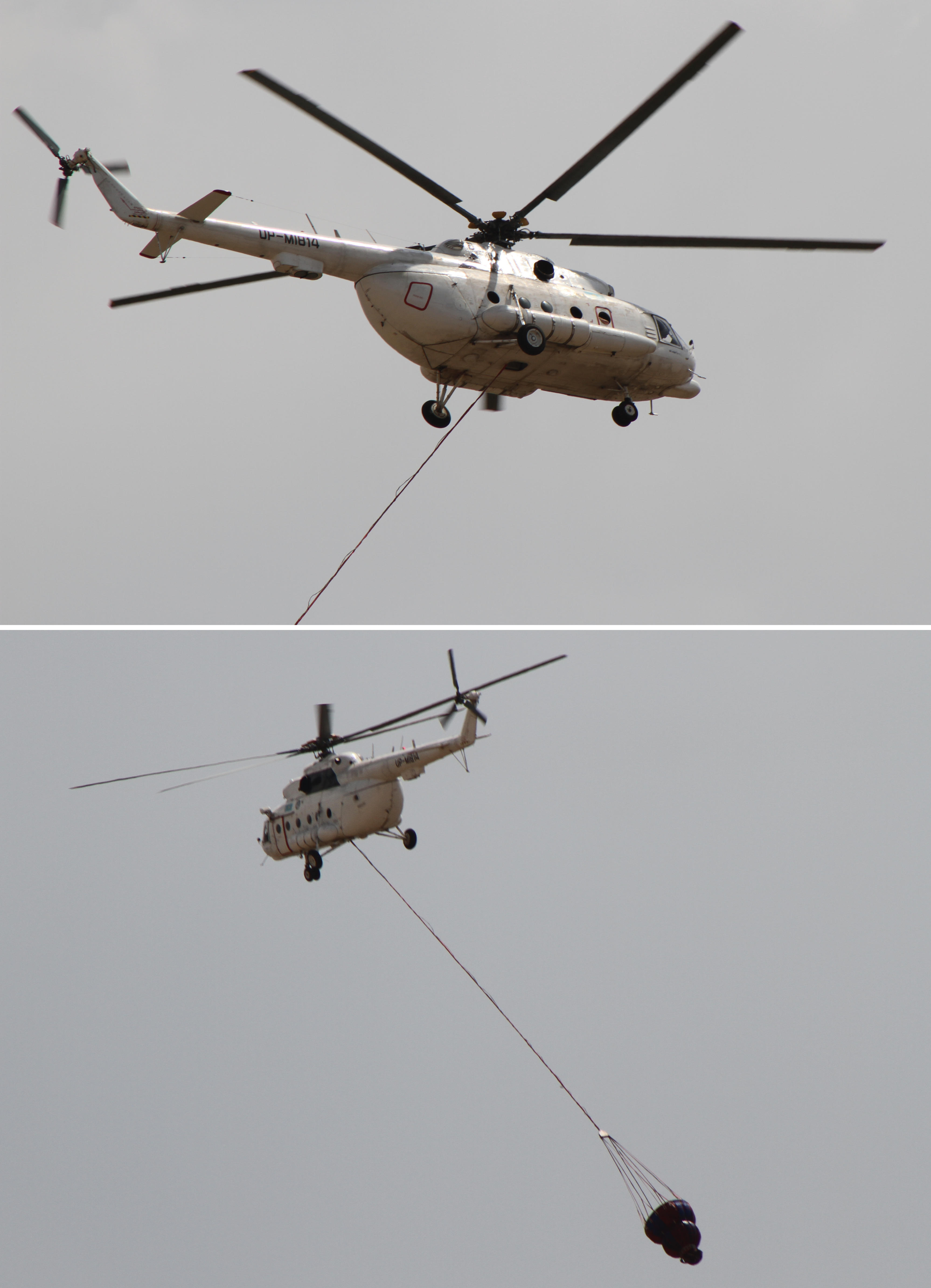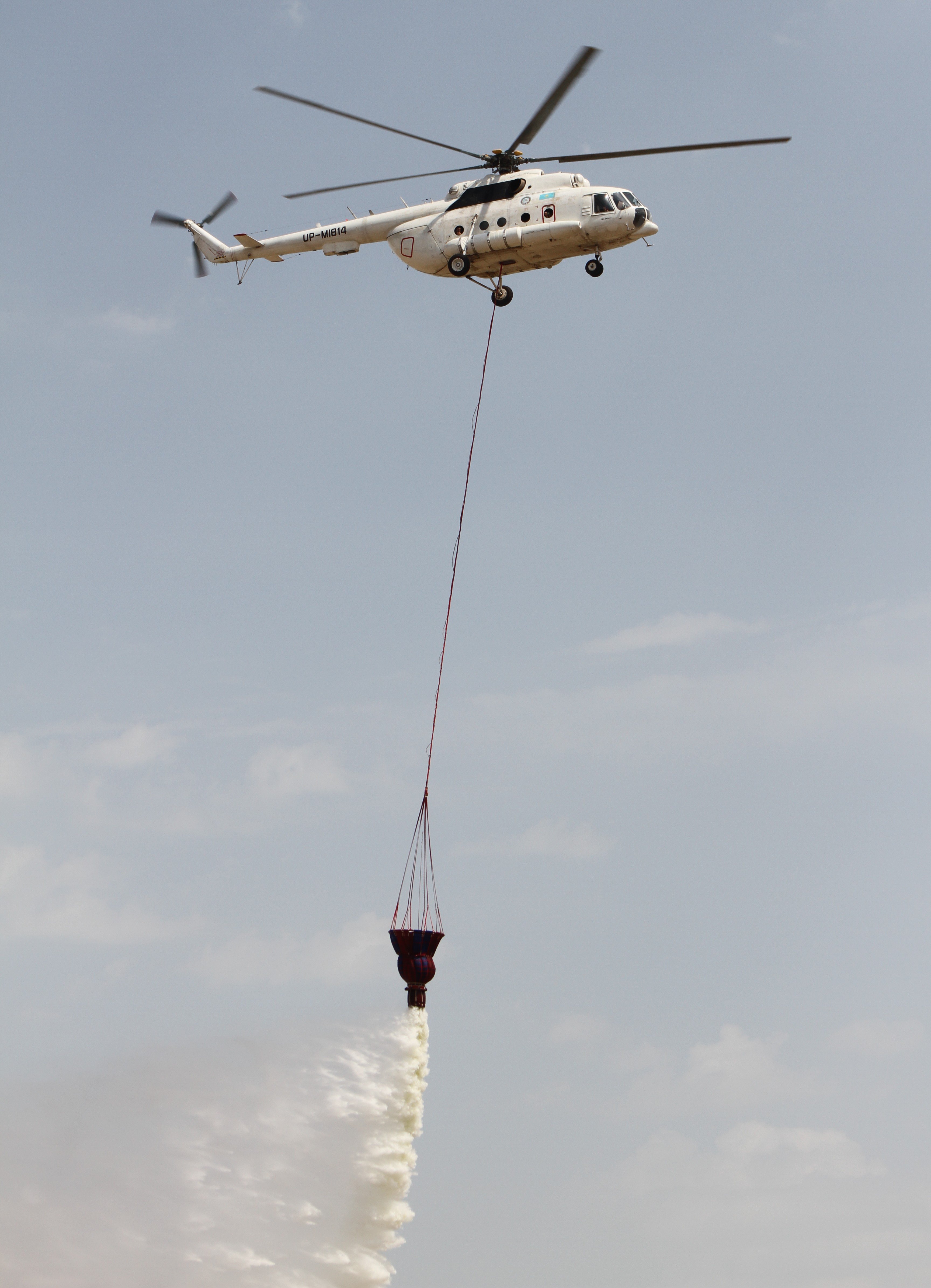 Тяжёлый многоцелевой Ми-8 почти буднично превратился в воздушного пожарного с подвеской водосливным баком. Такими тушат степные и лесные пожары в Казахстане.