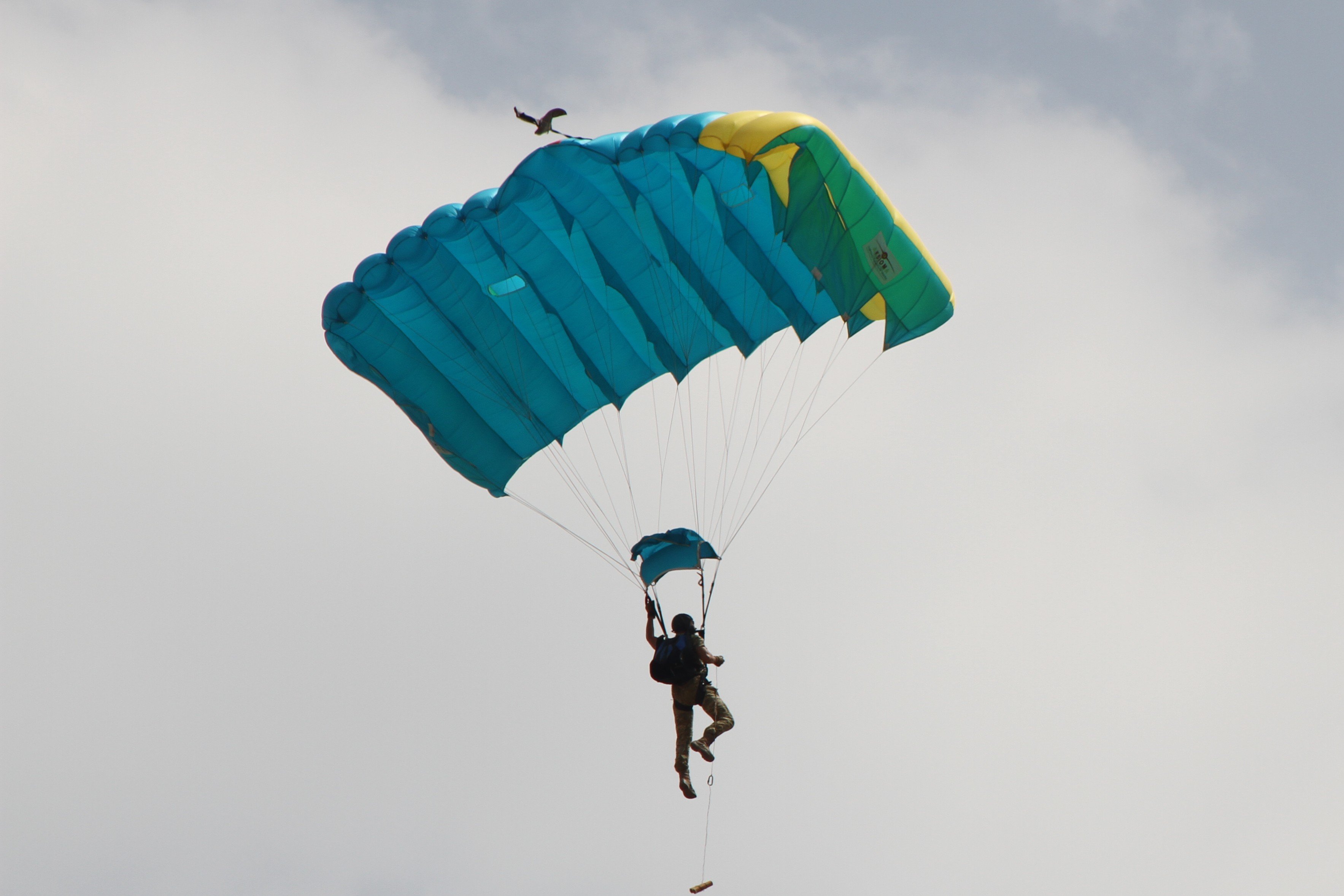 Особняком «нырял» в небо центр парашютной подготовки Вооруженных сил РК: мастер спорта Денис Исламов, Даурен Ержанов, Жаксылык Ерназар и Руфат Мурзапаров. Рядом нарезал круги беркут, словно проверял чужаков в своей стихии.