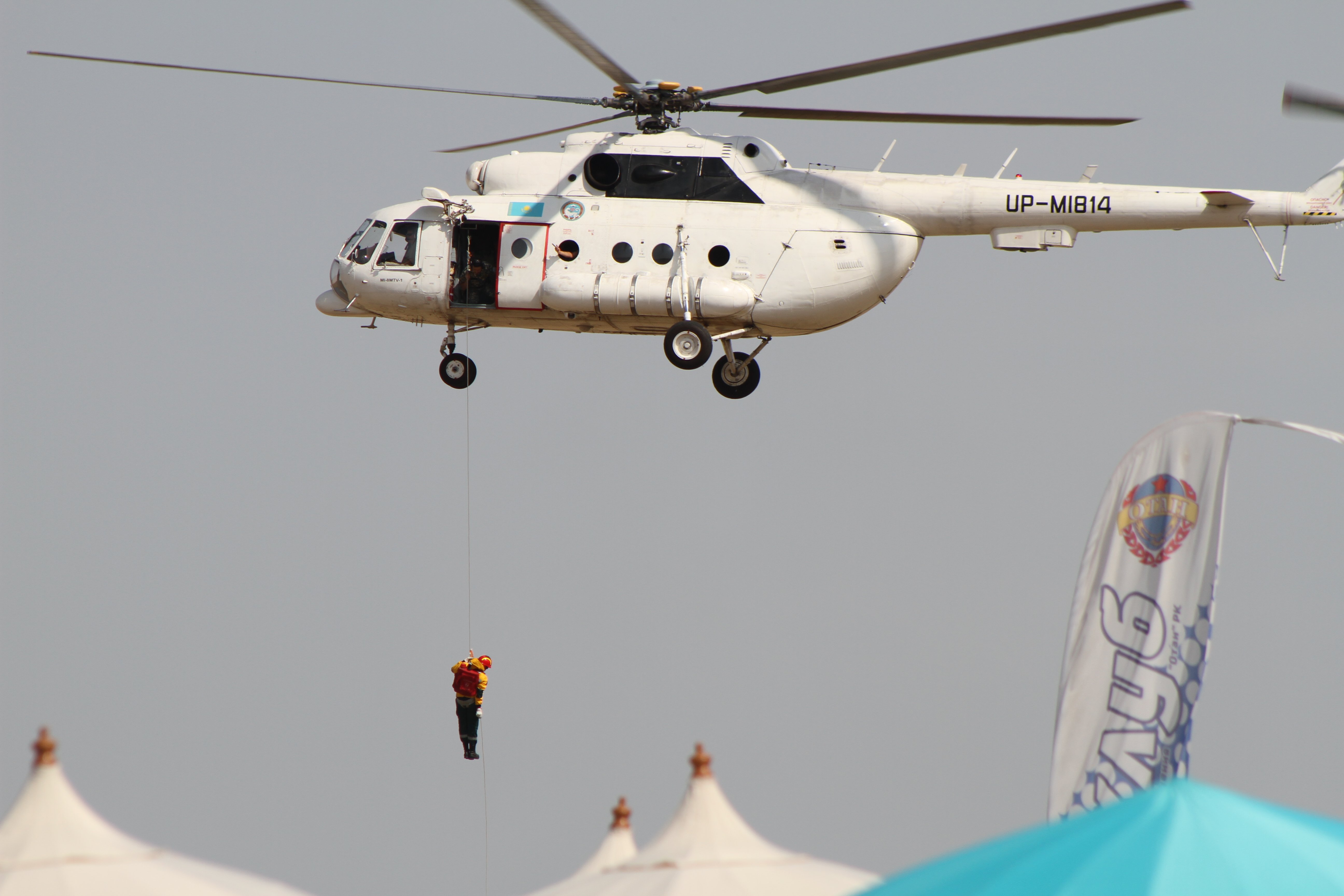 В полдень под гимн Казахстана шоу наконец началось. Его открыл советский многоцелевой вертолёт Ми-2, был разработан ОКБ Миля в начале 1960-х годов и впервые поднялся в небо в 1961-м. Серийное производство наладили в Польше на заводе WSK PZL-Świdnik уже в 1965 году. До самого конца выпуска в 1992-м было построено более 5400 машин.