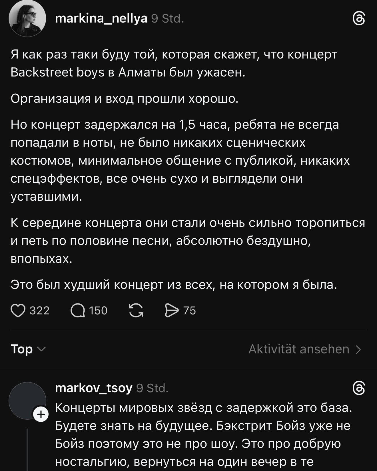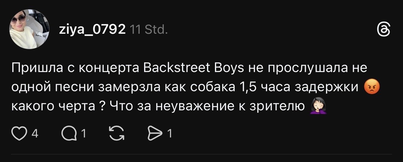 «Пришла с концерта Backstreet Boys, не прослушала ни одной песни, замёрзла, как собака. Полтора часа задержки, какого чёрта ? Что за неуважение к зрителю», написала одна из фанаток.