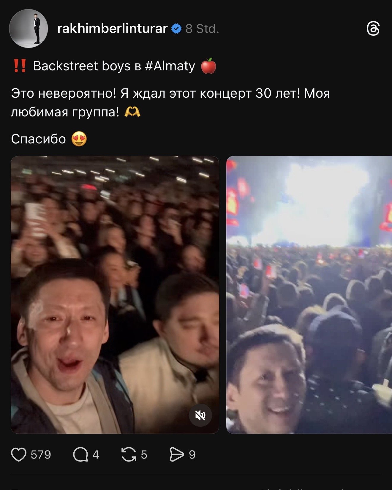 Судя по видео из инстаграма, которые нам удалось найти, начался концерт ещё далеко за пределами Казахстана, где-то в небе с десятками преданных фанатов… Сняла видео Альбина Мухамбаева, жена актёра и юмориста Рената Мухамбаева, того самого, что выступал в КВН «Камызяки».