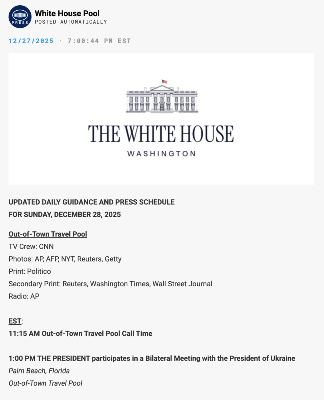 Ранее президент Украины заявил, что мирный план, состоящий из 20 пунктов, готов примерно на 90 %, дальнейшая судьба документа будет зависеть от итогов переговоров с президентом США.