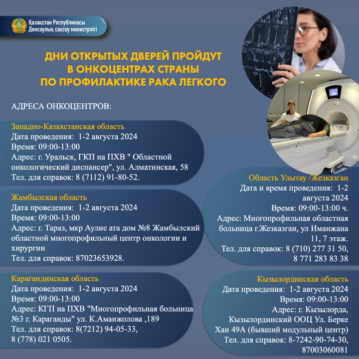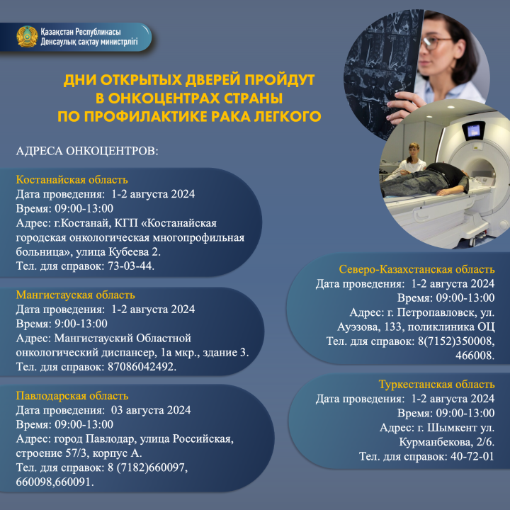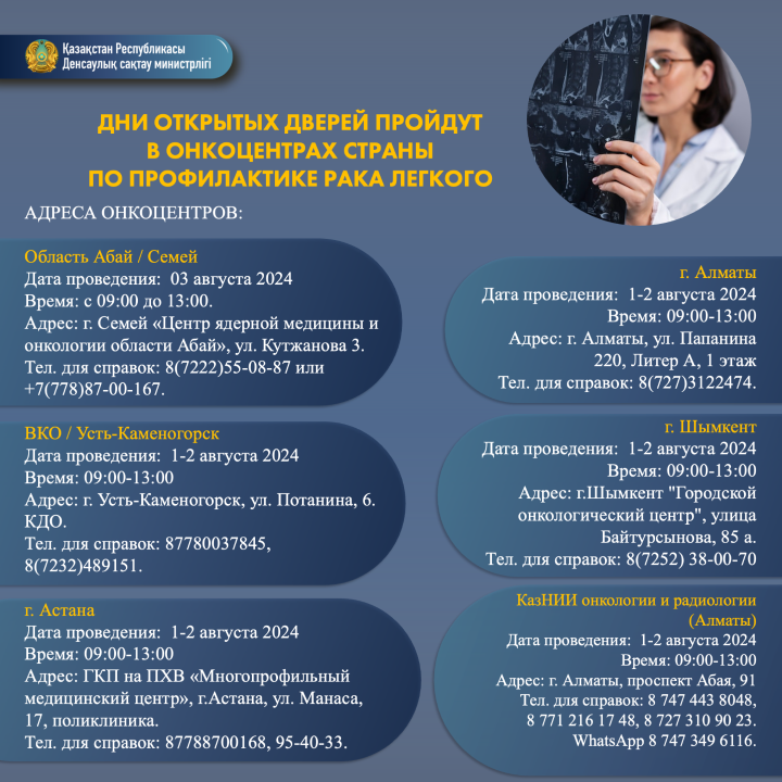 С 1 по 3 августа 2024 года государственные онкоцентры Казахстана приглашают всех желающих на Дни открытых дверей, посвященные профилактике и раннему выявлению рака легкого, сообщает Orda.kz со ссылкой на Минздрав РК.