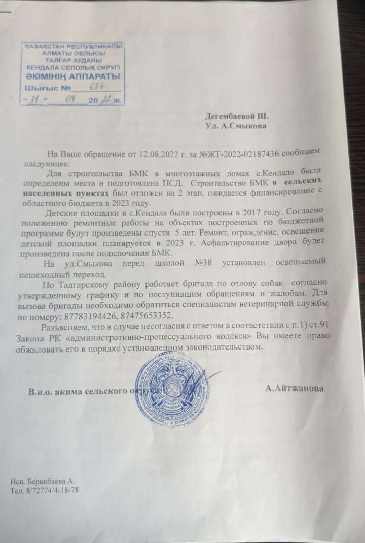 В августе 2022 года исполняющий обязанности акима Кендалинского сельского округа Айгерим Айтжанова письменно ответила жителям проблемных многоэтажек, что для строительства котельной уже определено место и подготовлена проектно-сметная документация.