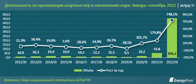 Рынок азартных игр бьёт все рекорды в Казахстане. С января по сентябрь 2022 года объём услуг казино, букмекеров и прочих компаний подобной направленности достиг внушительных 456,4 млрд тенге. Это в 8,5 раза больше, чем за аналогичный период 2021 года, сообщает Energyprom.kz.