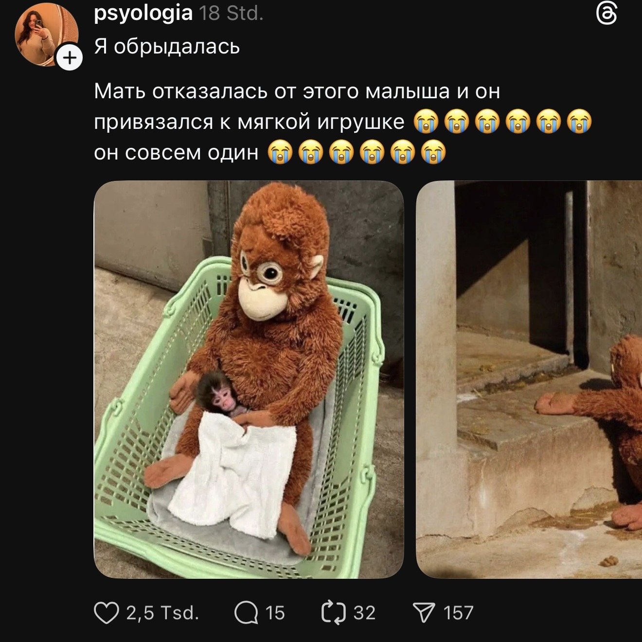 They gave him a plush orangutan toy, which he carries everywhere, hugging it while he sleeps, using it for… pic.twitter.com/qn1fO7Wu1n