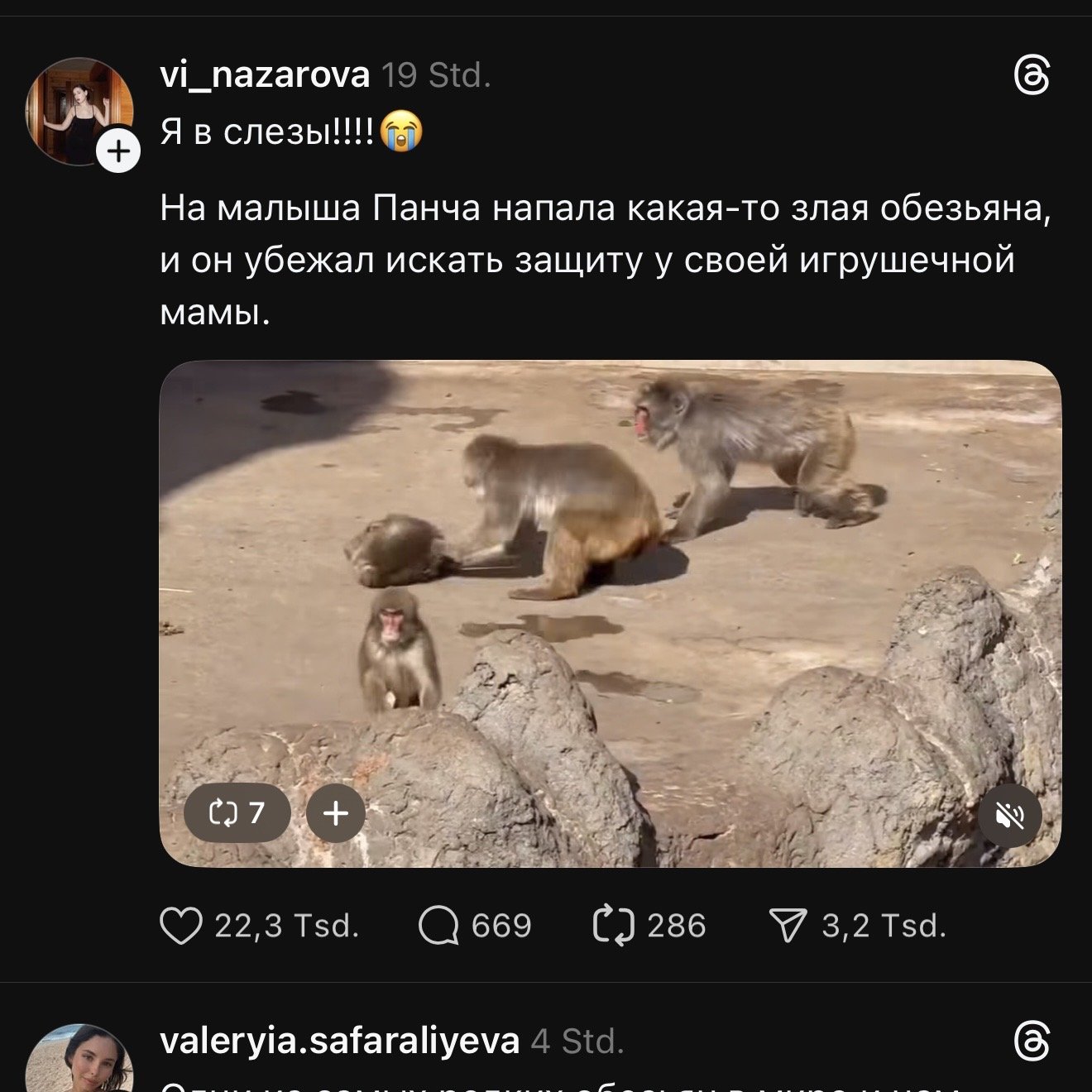 Настоящим вирусным символом недели стал детёныш макаки по кличке Панч из зоопарка Итикавы. Популярность набрало видео, где малыша обидели взрослые, и он убежал обнимать свою игрушку. Мама отказалась от него сразу после рождения, поэтому сотрудники дали малышу мягкую игрушку орангутана, чтобы снизить стресс. С тех пор он не расстаётся с ней — носит повсюду и засыпает только в обнимку с ней.