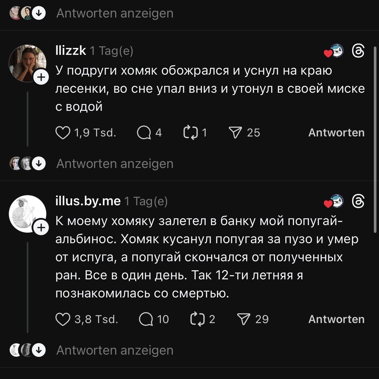 В Threads внезапно выстрелила ветка, которая началась с почти абсурдной истории: пользователь рассказал, что его хомяк погиб, когда на него упала… Библия с книжной полки. И задал вопрос: у кого ещё питомцы ушли максимально нелепо?