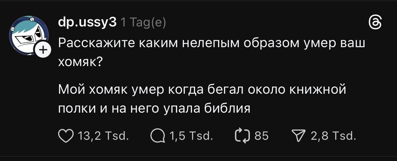 В Threads внезапно выстрелила ветка, которая началась с почти абсурдной истории: пользователь рассказал, что его хомяк погиб, когда на него упала… Библия с книжной полки. И задал вопрос: у кого ещё питомцы ушли максимально нелепо?
