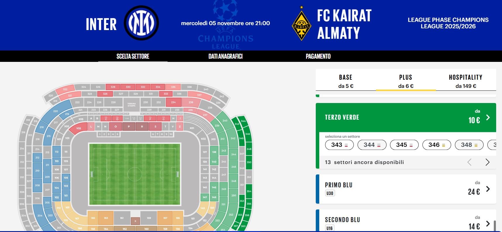 На официальном сайте «Интера» цена на билеты начинается от 10 евро — примерно 6 200 тенге — за дальние места на секторе за воротами.