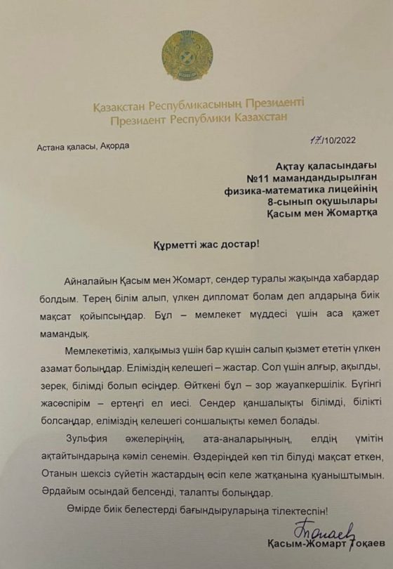 "Айналайын Касым и Жомарт, я недавно услышал о вас. Вы ставите перед собой высокую цель - получить образование и стать великими дипломатами. Эта профессия очень нужная для государства.Будьте такими гражданами, которые много работают для нашей страны и народа. Будущее нашей страны заключено в молодежи. Вот, почему вы должны вырасти умными, интеллигентными и образованными. Это большая ответственность. Сегодняшняя молодежь – это завтрашние хозяева страны. Чем образованнее и квалифицированнее вы будете, тем совершеннее будет будущее нашей страны. Я верю, что вы оправдаете ожидания своей бабушки Зульфии, ваших родителей и страны. Я рад, что подрастают молодые люди, безгранично любящие свою родину и стремящиеся, как и вы, выучить столько же языков. Будьте всегда такими же активными и целеустремлёнными. Желаю вам достичь больших высот в жизни!", – говорится в письме.
