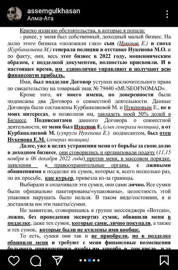 "Ранее у меня был собственный доходный малый бизнес. На долю этого бизнеса положили глаз сын (Нукенов Е.) и сноха (Курбаналиева М.) генерала полиции в отставке Нукенова М.О., и по факту они весь этот бизнес в 2022 году мошенническим образом, с подделкой документов, полностью присвоили. И в настоящее время им единолично управляют и получают всю финансовую прибыль", – написала Хасангалиева в социальной сети.