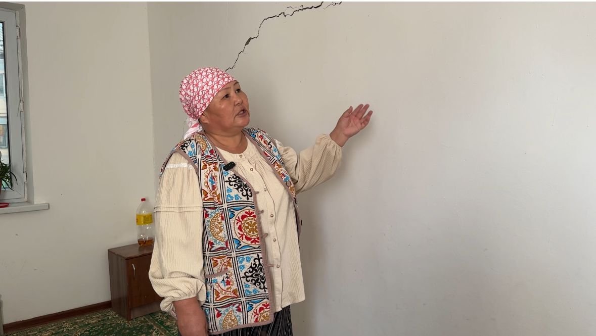 Айгуль Ергешова получила квартиру по государственной программе три года назад. Она рассказывает, что уже через год стены начали разрушаться. Ей пришлось переехать в другую квартиру в том же дворе. Но и там ситуация плохая. Трещины в стенах настолько большие, что можно увидеть соседние квартиры.