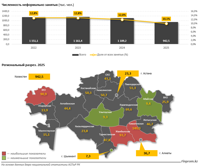 Наибольшее число неформально занятых зафиксировали в Алматинской области (149 тыс. человек), а также в Жамбылской и Западно-Казахстанской областях. Меньше всего таких работников — в Шымкенте и области Улытау.