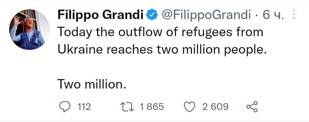 «Сегодня отток беженцев с Украины достиг двух миллионов человек. Два миллиона человек», – написал в Twitter комиссар ООН по делам беженцев Филиппо Гранди 8 марта.