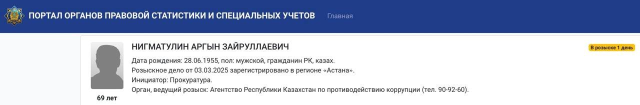 В объявлении о розыске говорится, что дело зарегистрировали 3 марта 2025 года в Астане.
