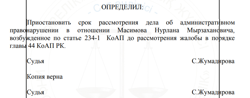 Первое слушание назначили на 29 декабря 2022 года, но защитники Масимова попросили отложить его на 9 января. Чтобы подозреваемый предоставил доказательства и ознакомился с документами, судебное заседание вновь перенесли – на 13 января. В этот день адвокаты подали жалобу на действия должностного лица по составлению протокола об административном правонарушении. Специализированный административный суд Павлодара приостановил дело. Однако, судья решил вызвать заявителя по делу, должностное лицо, чьи действия обжалуются. А также истребовать материалы дела об административном правонарушении.