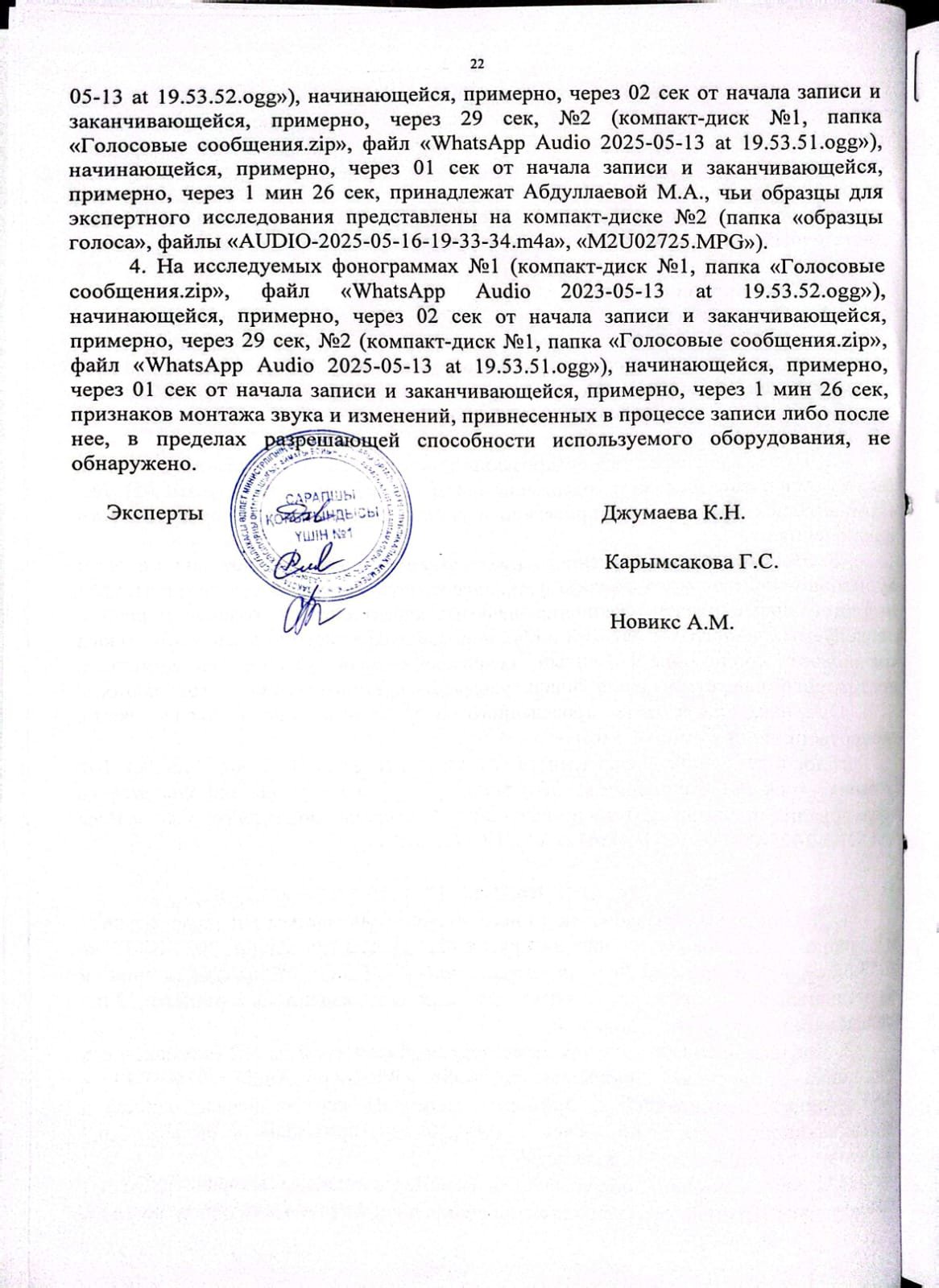 26 июня 2025 года пришло заключение экспертов. Выяснилось, что плёнка не смонтирована, и голос на ней принадлежит Мадине Абдуллаевой.
