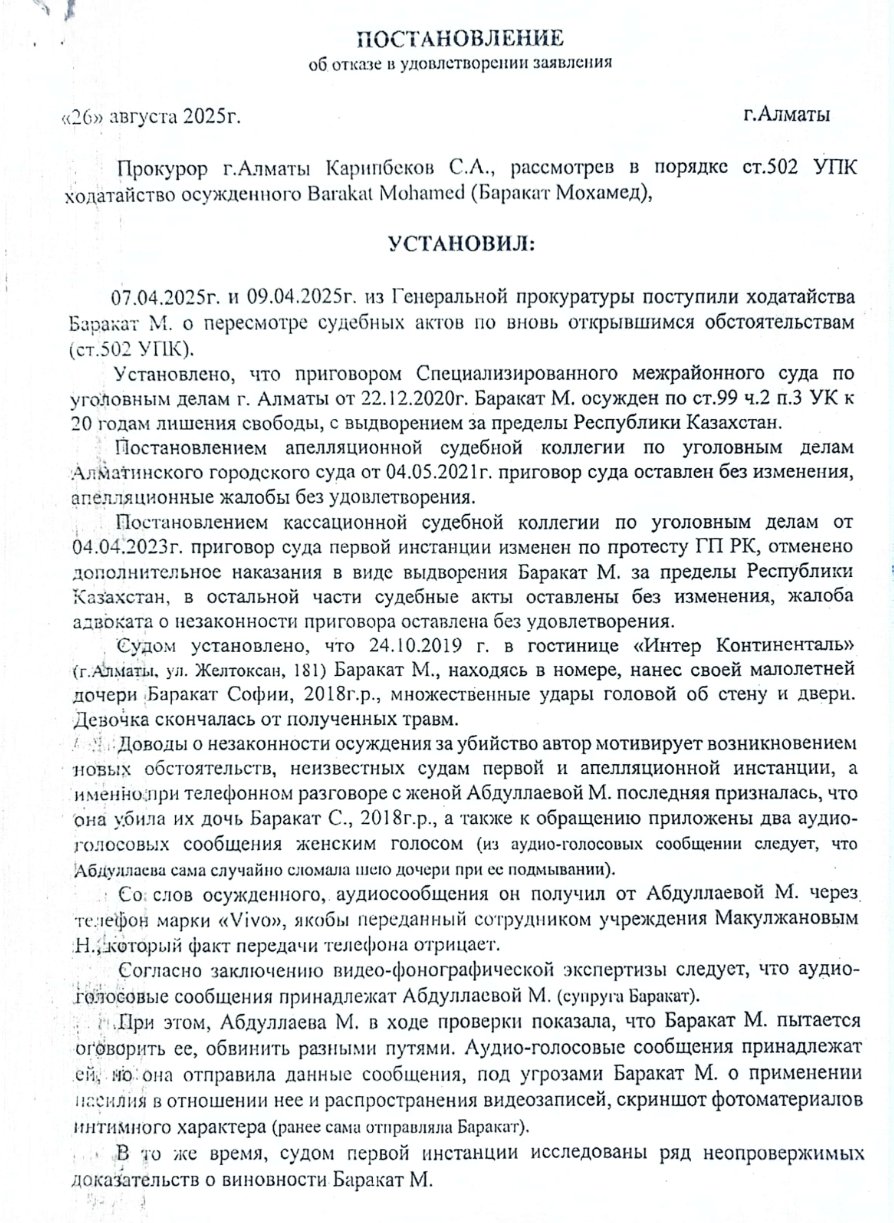 В прокурорском постановлении говорится, что в ходе проверки допросили эксперта Кульмаханова. Он подтвердил заключение старой экспертизы и пояснил, что причина смерти Софии Баракат от перелома шеи исключается. Таким образом, доводы о незаконном осуждении и причастности к смерти Софии её матери необоснованны. Они противоречат материалам уголовного дела и не нашли подтверждения. На этом основании прокурор города Алматы Карипбеков отказал в удовлетворении ходатайства Бараката. И напомнил ему, что тот может обжаловать его постановление вышестоящему прокурору или в суде в порядке ст. 105 УПК РК.