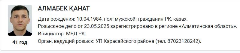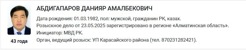 Карточки Абдигапарова и Алмабека появились на портале органов правовой статистики и спецучётов в разделе «Розыск преступников». Согласно размещённым данным, МВД ищет бывших руководителей «Алтын Орды» уже три дня — с 23 мая 2025 года.