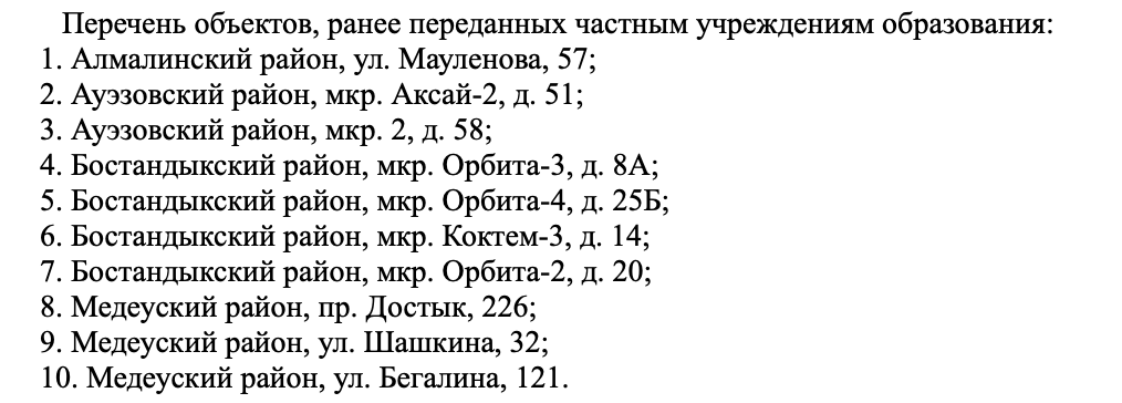 По информации управления госактивов Алматы, с 2002 года 10 зданий детских садов (полностью или частично), а также одно здание бывшего производственного комбината передали в аренду частным дошкольным организациям и школам.