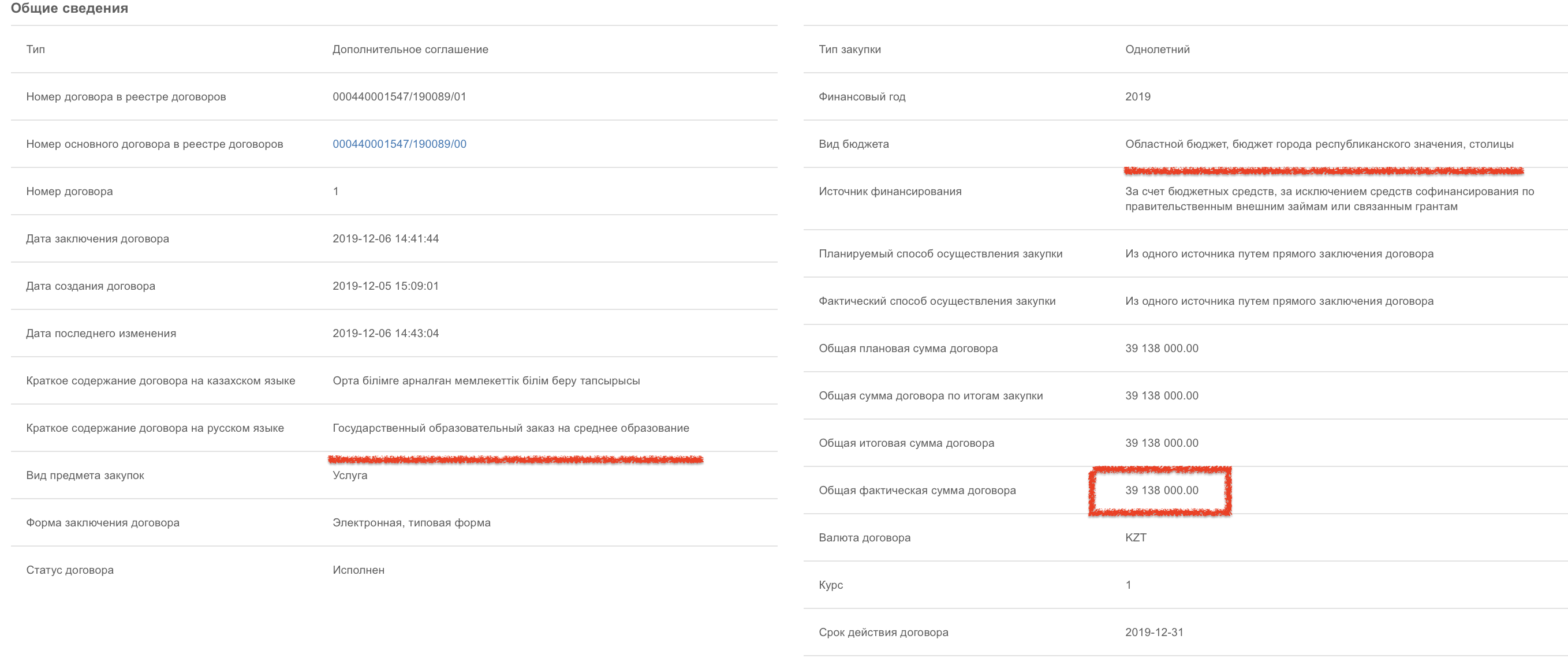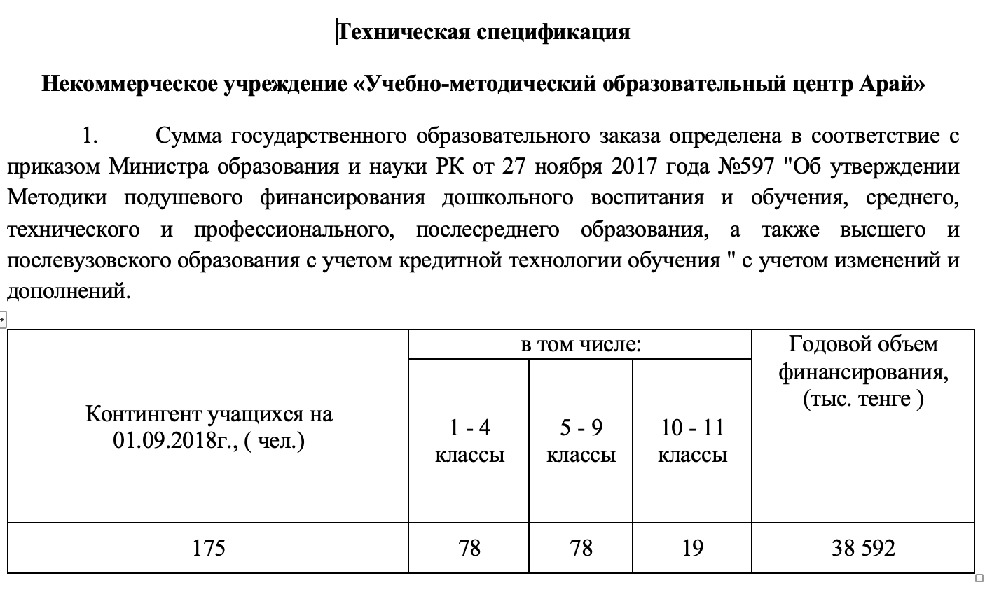 С частными школами существует похожая практика. Например, в 2019 году некоммерческое учреждение «Учебно-методический образовательный центр "Арай"» (та самая школа, о которой мы говорим) исполнило дополнительное соглашение о государственном образовательном заказе на среднее образование на сумму 39 млн тенге. Других договоров «Арай» не брали. Подробнее назначение средств делалось как «услуги по софинансированию грантов».
