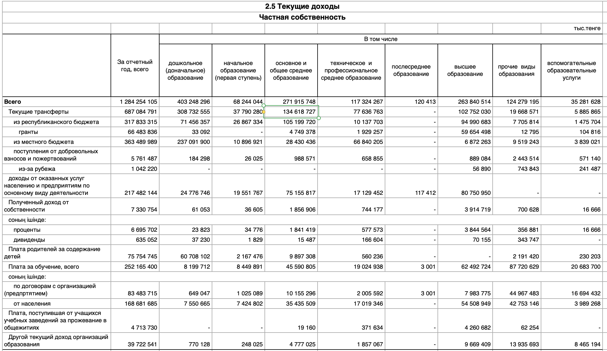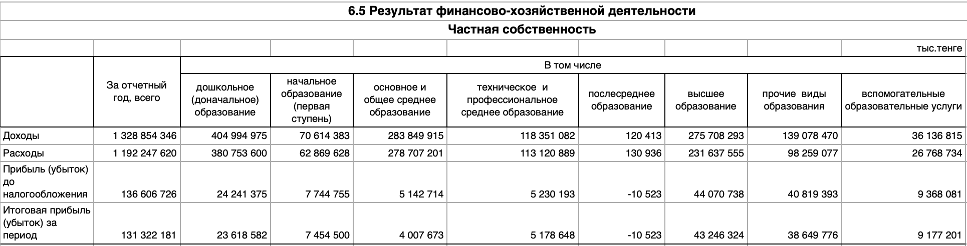 Доход образования, обеспечиваемый частным сектором, — 1,3 трлн тенге, расходы — 1,2 трлн.