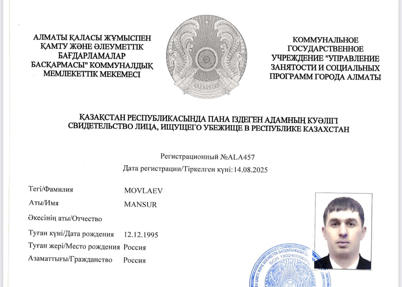 Чеченскому оппозиционному активисту Мансуру Мовлаеву продлили статус лица, ищущего убежище в Республике Казахстан. Об этом в своём фейсбуке сообщил один из его адвокатов Мурат Адам, опубликовав соответствующий документ, информирует Orda.kz.
