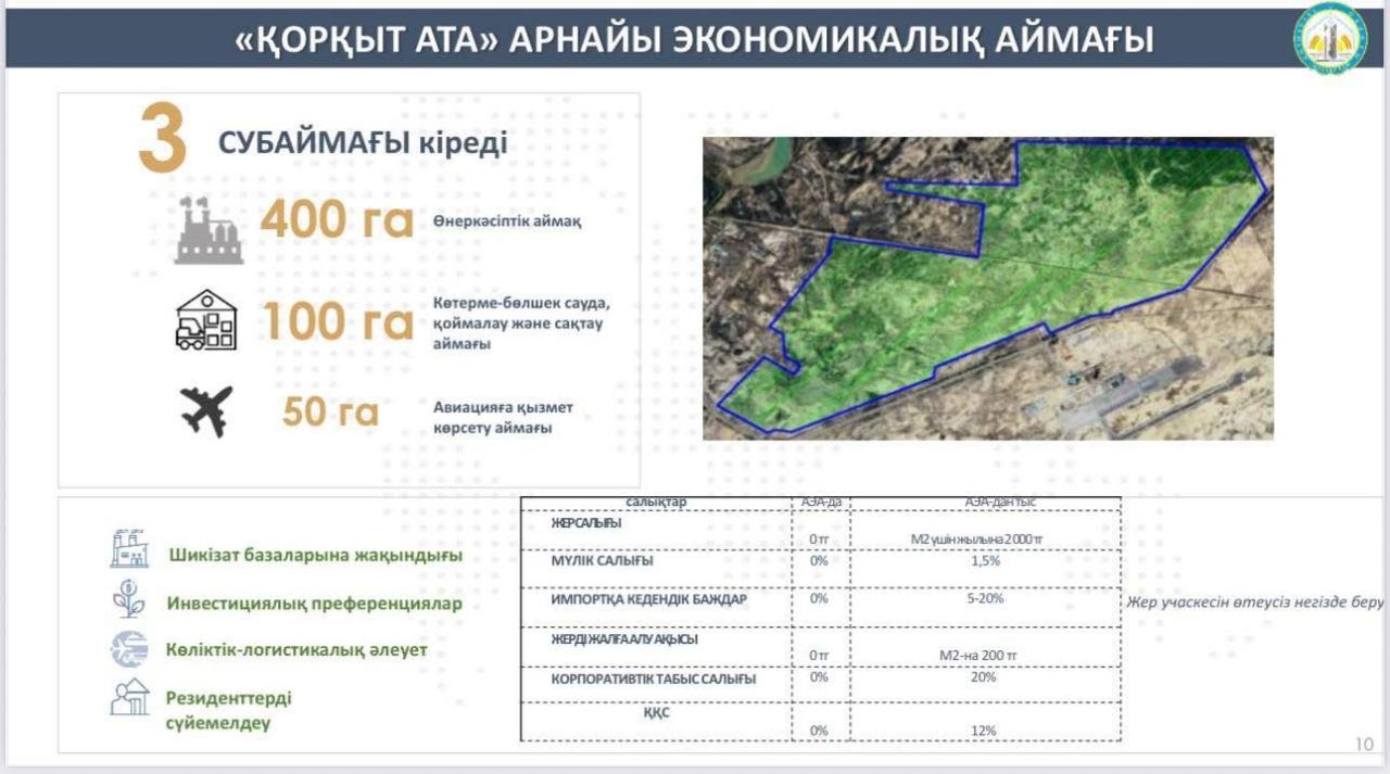 СЭЗ «Коркыт Ата» построили рядом с аэропортом Кызылорды. Общая площадь новой зоны — 550 гектаров. По плану правительства, зона должна снизить зависимость региона от нефтяной отрасли и стать новым индустриальным и логистическим хабом.