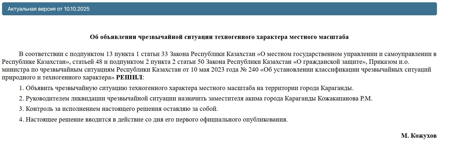 По логике, при отсутствии самой аварии, но при наличии угрозы, должен вводиться режим повышенной готовности системы гражданской защиты. Но в Караганде ввели именно режим ЧС.