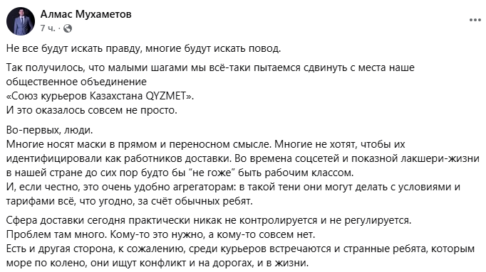 «Если честно, трудностей было много. Постепенно они решаются. И сейчас мы можем сказать прямо: Союз курьеров Казахстана QYZMET в ближайшее время начнёт практическую работу. Наша цель простая и понятная: защищать интересы курьеров. И что принципиально важно, это будет абсолютно бесплатно для любого желающего»,написал Алмас Мухаметов.
