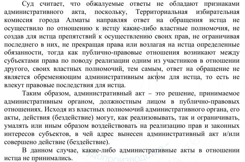 «...касательно осуществления проверки действий (бездействия) территориальной избирательной комиссии города Алматы и аппарата акима города Алматы в части перечисления избирательных взносов в доход республиканского бюджета по обращению гражданки Мустафаевой сообщает следующее... рассмотрение вопросов перечисления избирательных взносов в государственный бюджет выходит за пределы компетенции агентства».