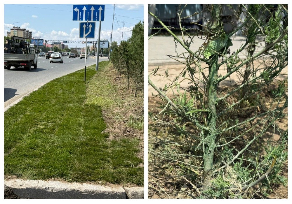 В районе Института воздушно-космической обороны имени Талгата Бегельдинова та же картина. Засохшие деревья, покрашенные в зелёный, и свежий газон вдоль дороги.