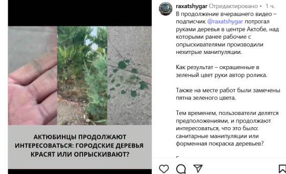 Тем не менее в акимате всё отрицают. Пресс-секретарь главы города Айгуль Байменова заверяет, что «никакой покраски деревьев не было».