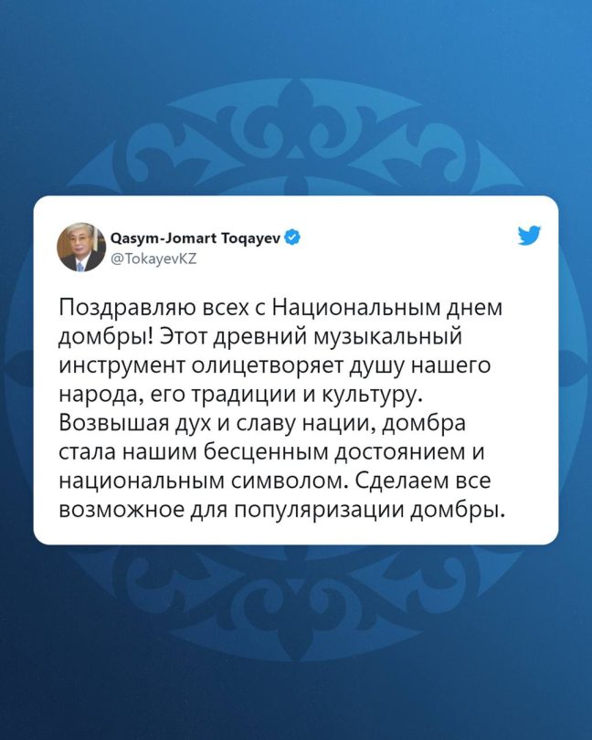 «Поздравляю всех с Национальным днем домбры! Этот древний музыкальный инструмент олицетворяет душу нашего народа, его традиции и культуру. Возвышая дух и славу нации, домбра стала нашим бесценным достоянием и национальным символом. Сделаем все возможное для популяризации домбры», – написал Глава государства.